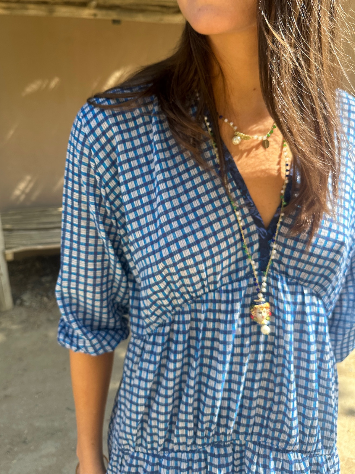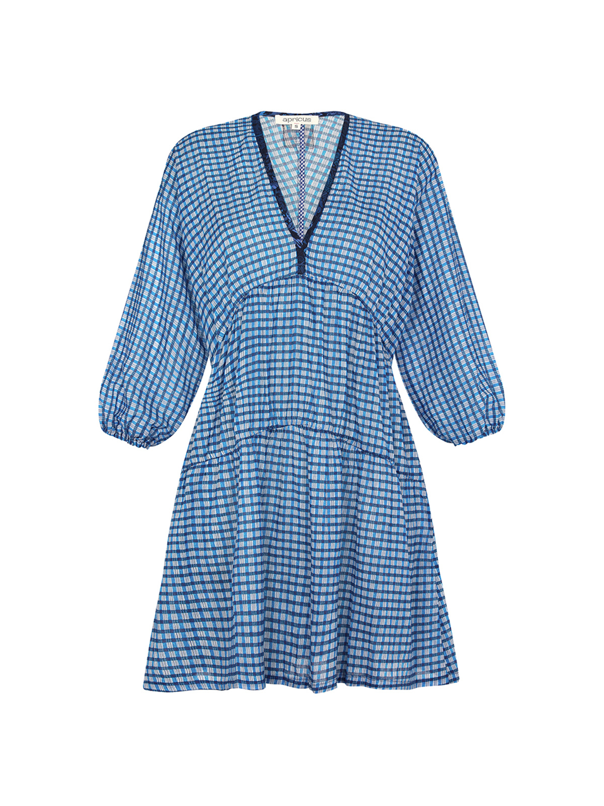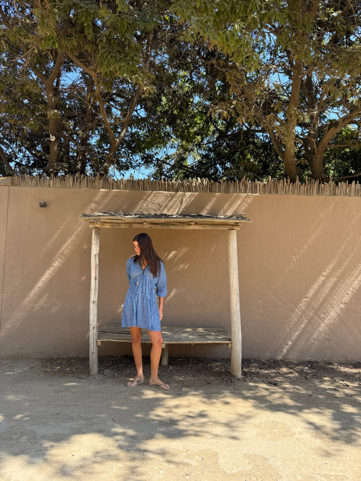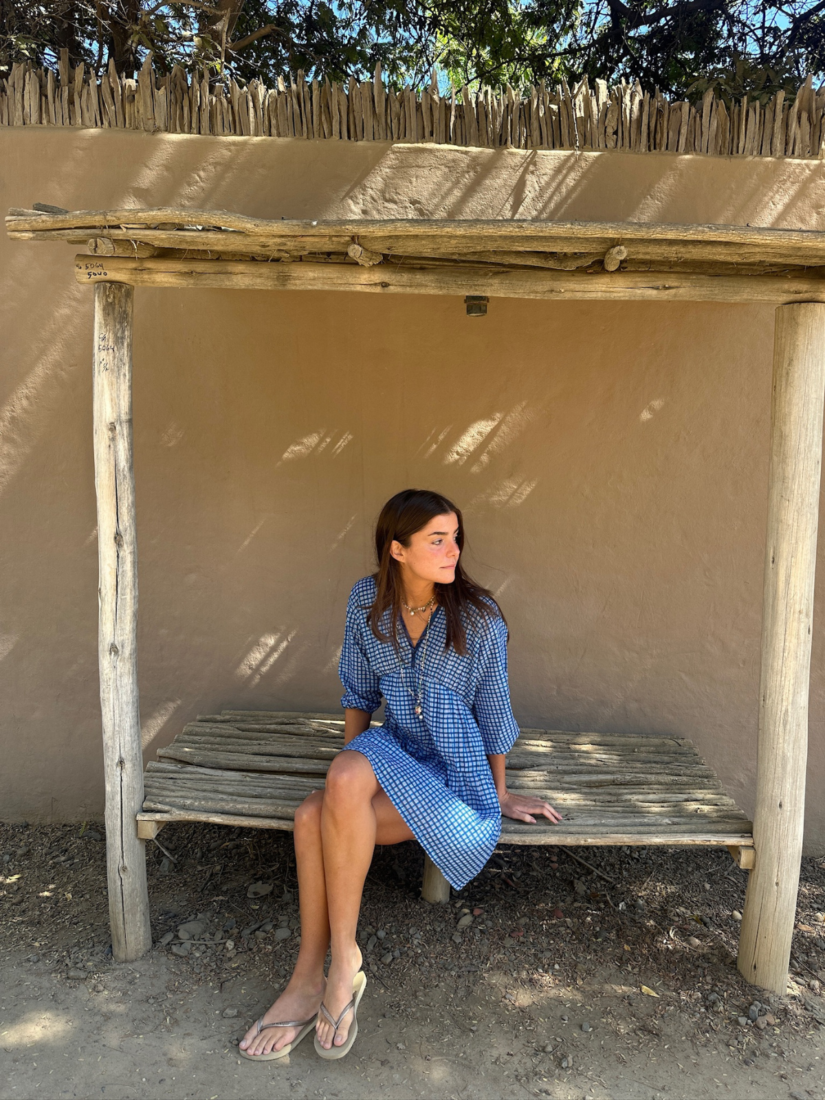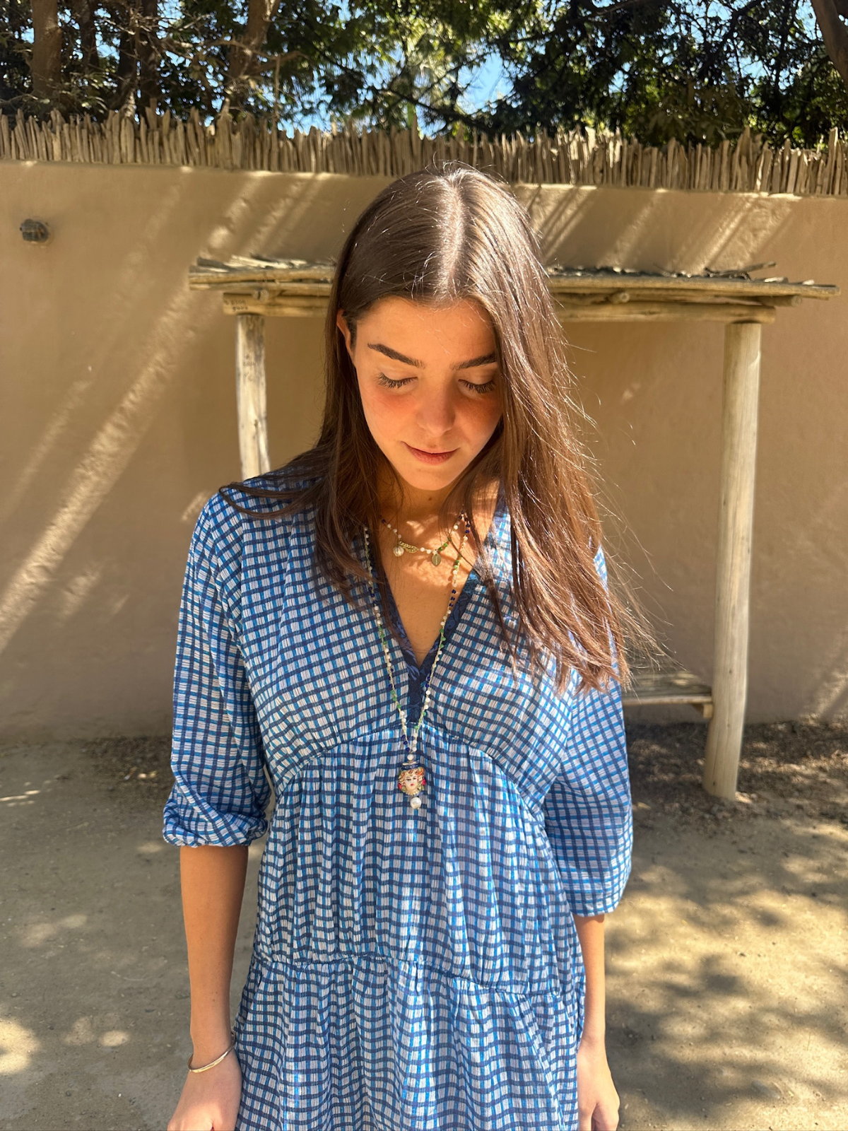 Crafted from soft, slightly translucent 100% cotton, the Valeria Beach Dress is perfect for sunny days. It features a flattering V-neckline, 3/4 sleeves with elastic cuffs for a comfortable fit, and a three-tiered skirt that falls above the knee. Its lightweight fabric makes it ideal for warm weather or as a stylish beach cover-up.