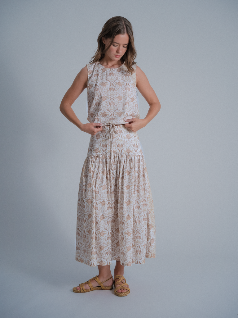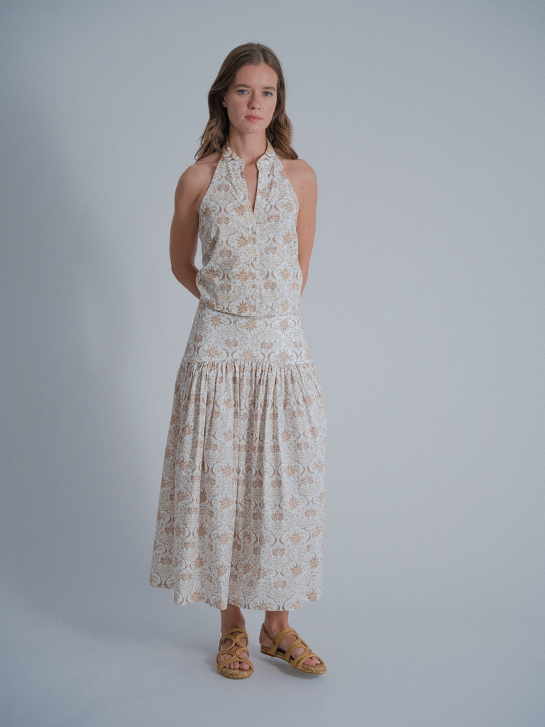 The Martha Skirt is a drop-waist midi crafted from 100% cotton poplin, designed to keep you cool and comfortable on warm days. Lightweight and wrinkle-resistant, this skirt features a seamless back zipper for a flawless silhouette. Pair it with the matching top for a fresh, put-together look perfect for any sunny escape.