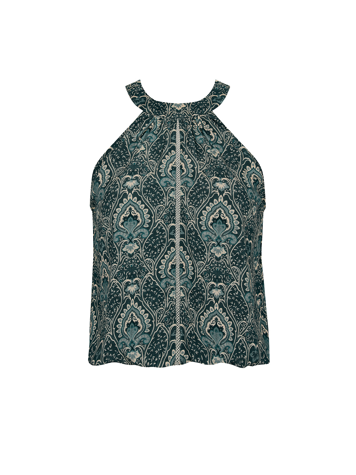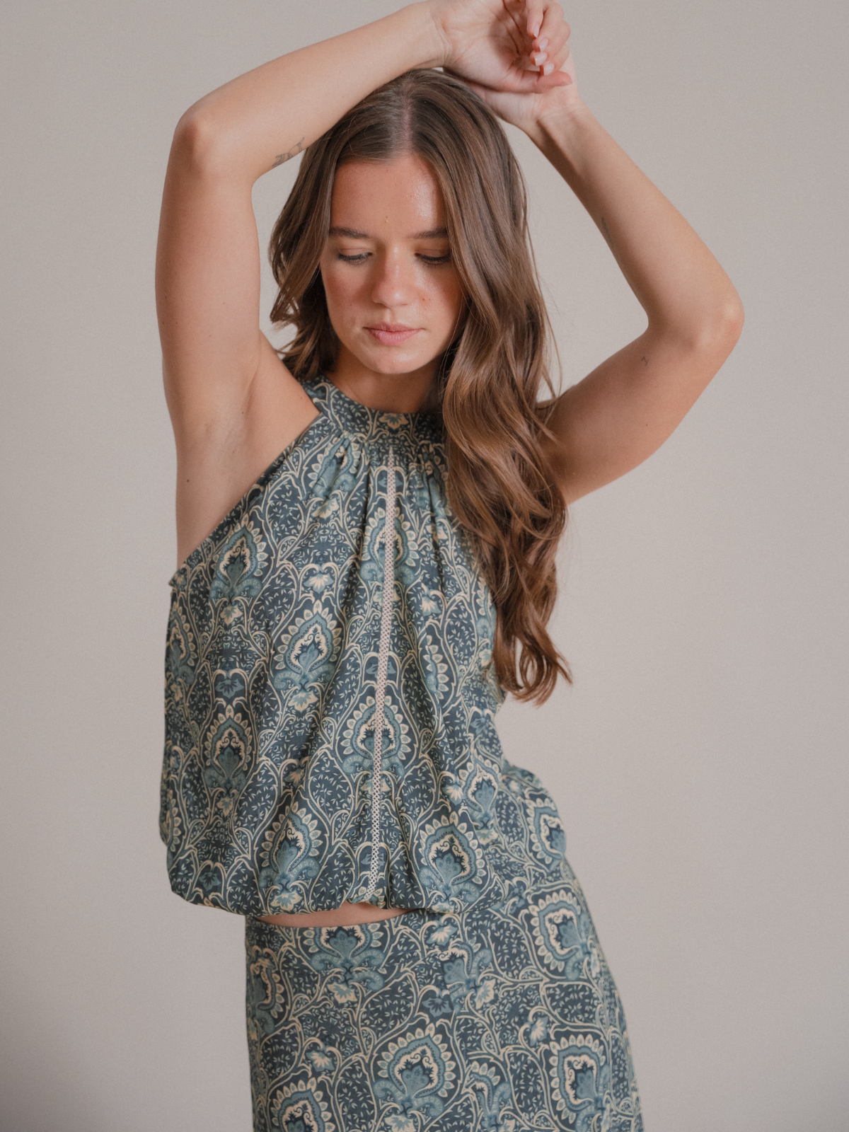 The halter top has openwork details on the center front and features a soft elastic waistband. Wear it on its own for an easy, stylish look, or pair it with the matching skirt to make it look like a dress. Made from 100% Ecovero Viscose. Delicate wash only.