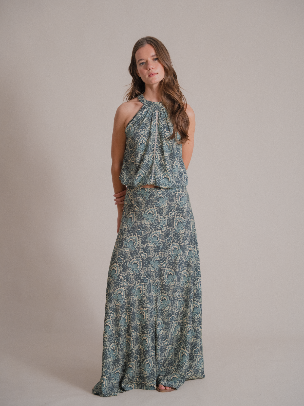 Crafted from 100% Ecovero Viscose, the Maria long skirt is lightweight and soft to the touch. Designed with a high waist, it features a concealed side zipper and side leg cutouts for effortless movement. Pair it with either one of the matching tops to style it as a dress. Delicate wash recommended.
