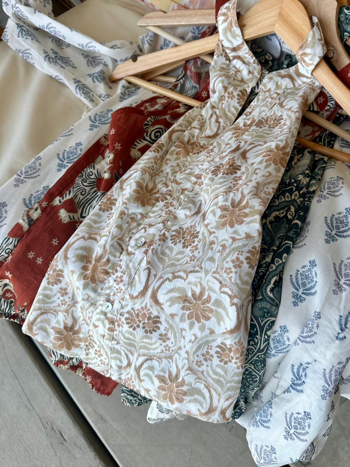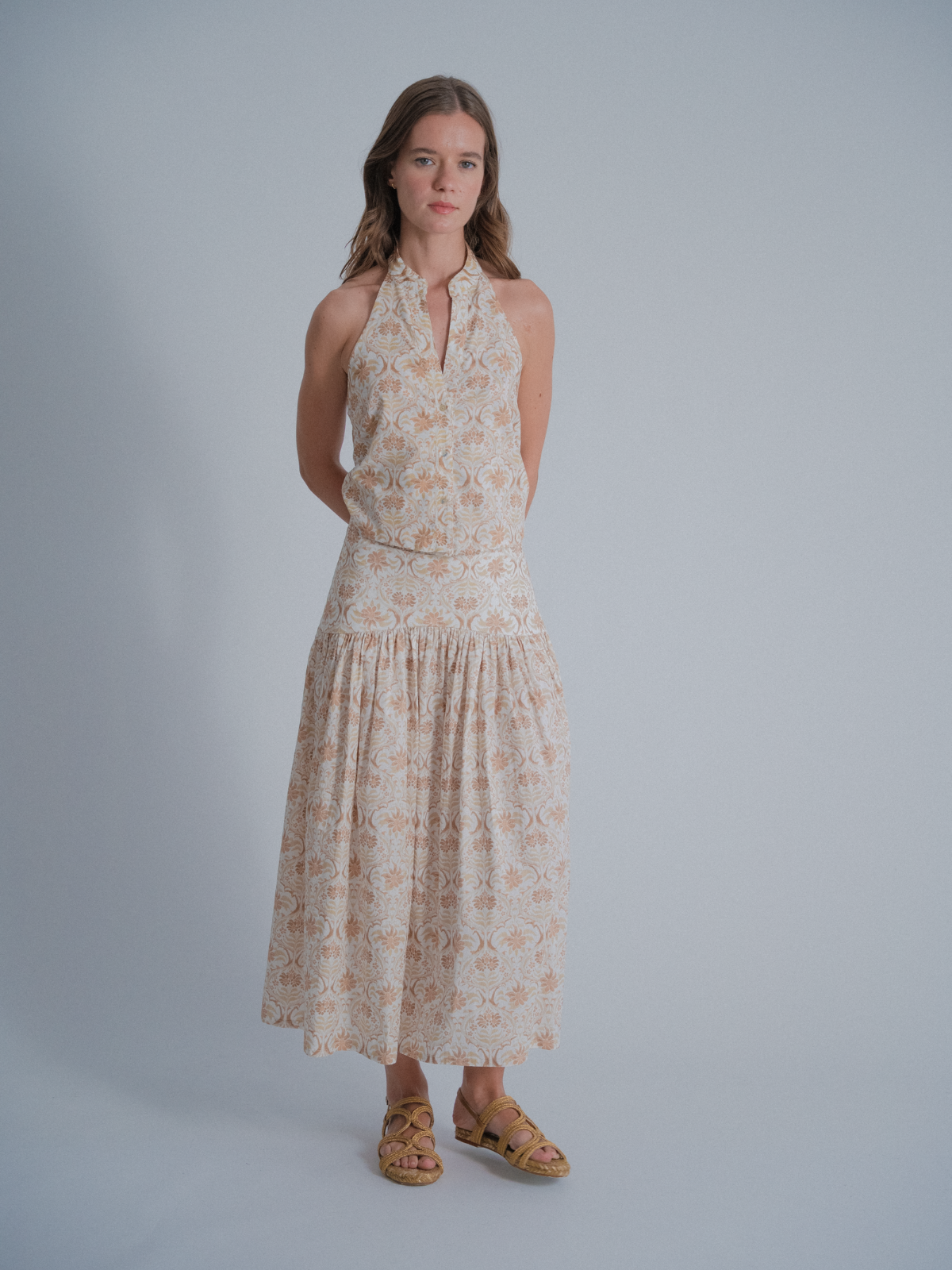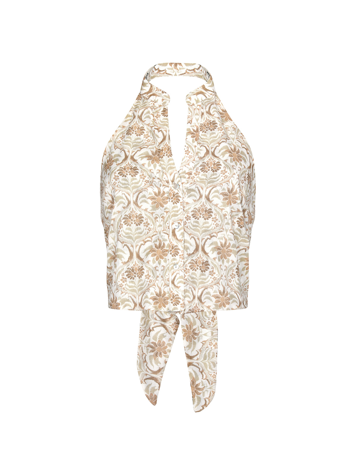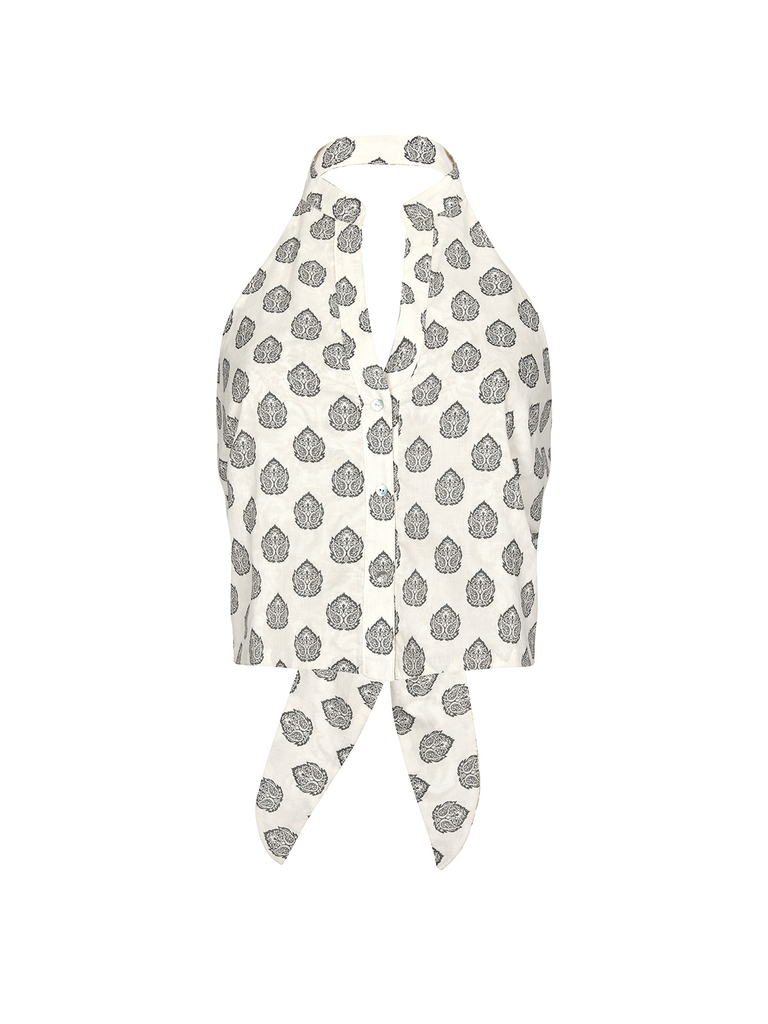 This top features a flattering V-neckline, a button-down front, and an open lower-back detail. It’s fully reversible: one side in the Opalo print and the other in the Helios print, so you can pair it with the Ópalo midi or mini skirt, or the Helios midi skirt, for a dress-style look. Lightweight and breathable, it’s an easy piece to wear with neutrals or to mix with prints.