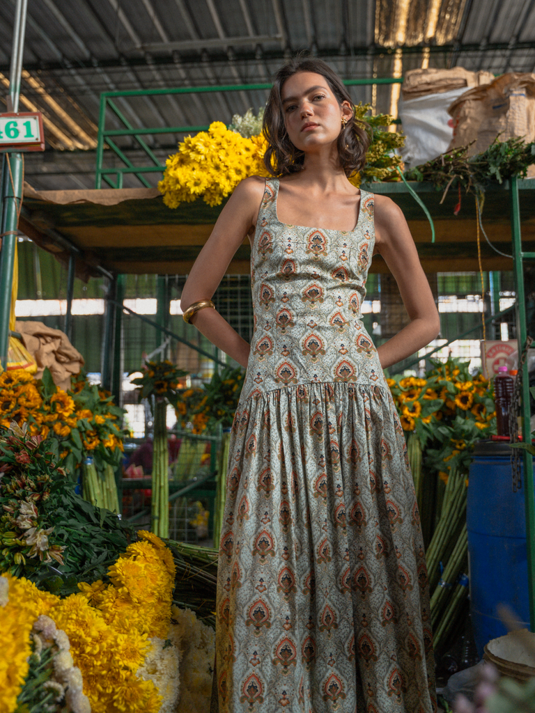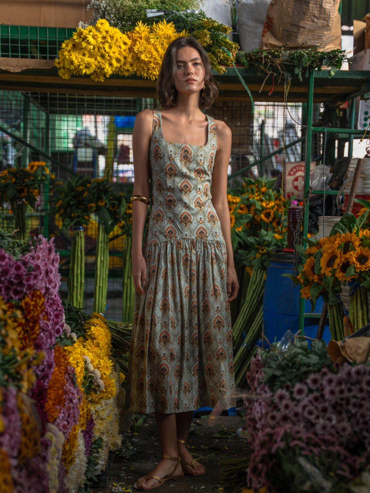 The Maria Luisa dress is made from 100% cotton poplin, offering a crisp yet lightweight feel that’s perfect for warm days. The drop-waist design creates a flattering, elongated silhouette, flowing into an A-line midi skirt that moves beautifully with you.