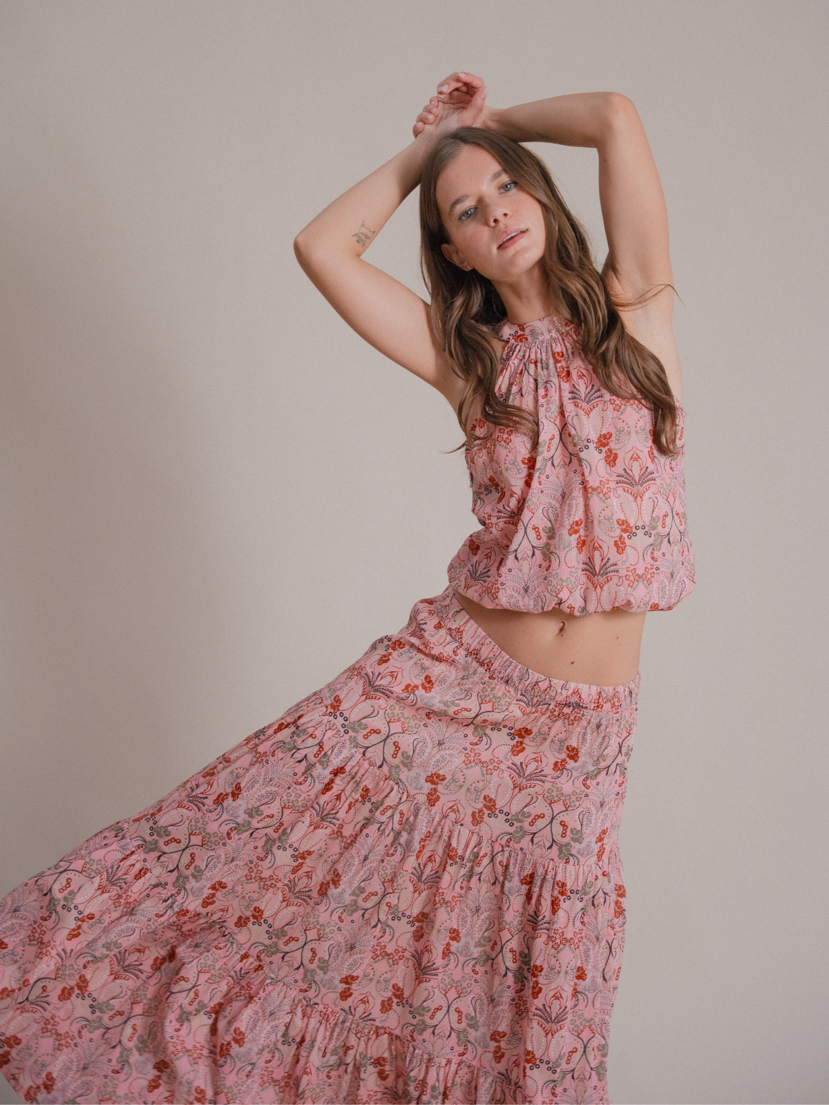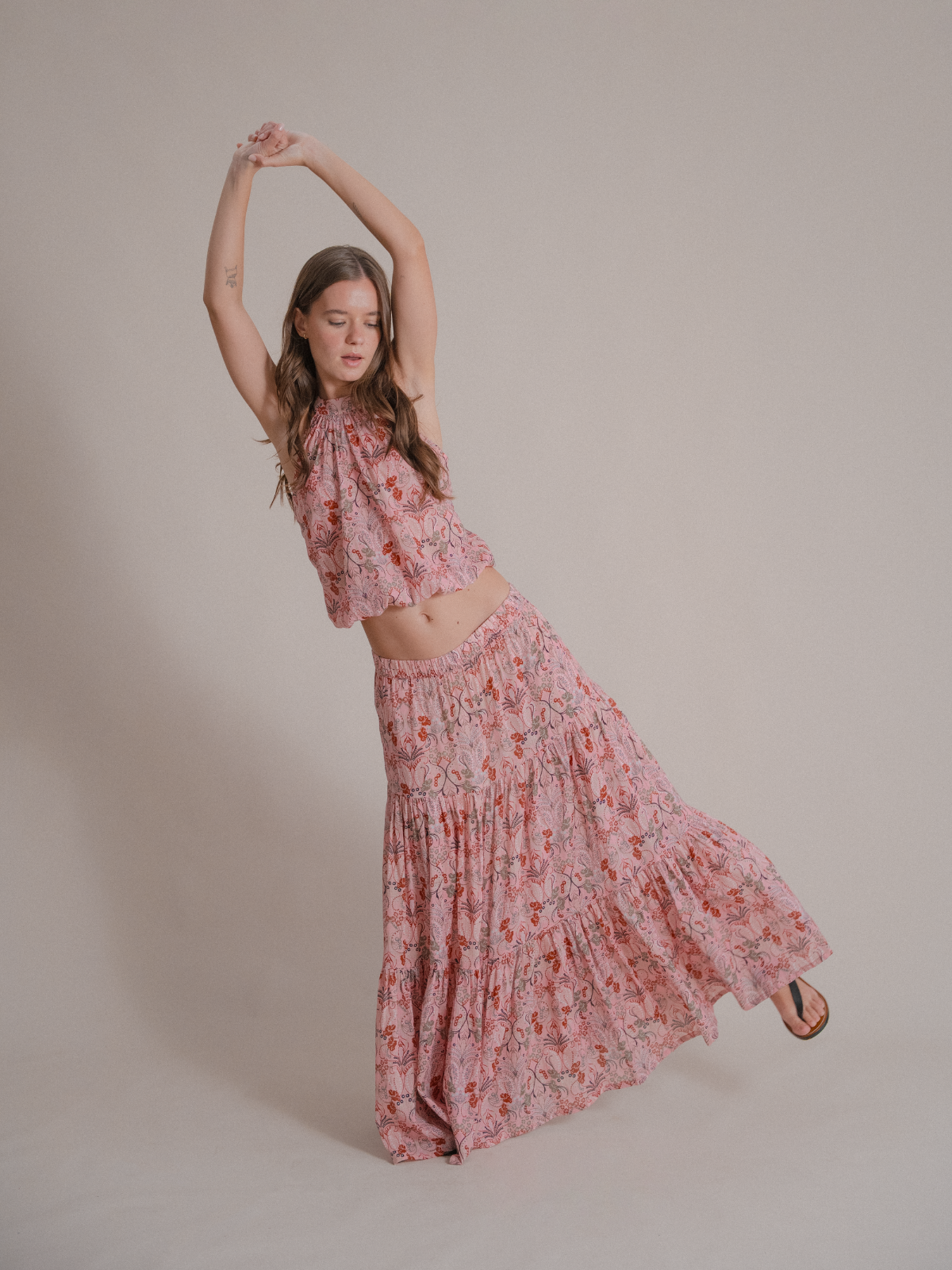 The Andrea Skirt is a flowy, full-length maxi made from 100% cotton. It features a soft elastic waistband for comfort and a three-tier design for a relaxed, stylish look. Unlined and lightweight, it’s perfect for easy, everyday wear or dressing up.