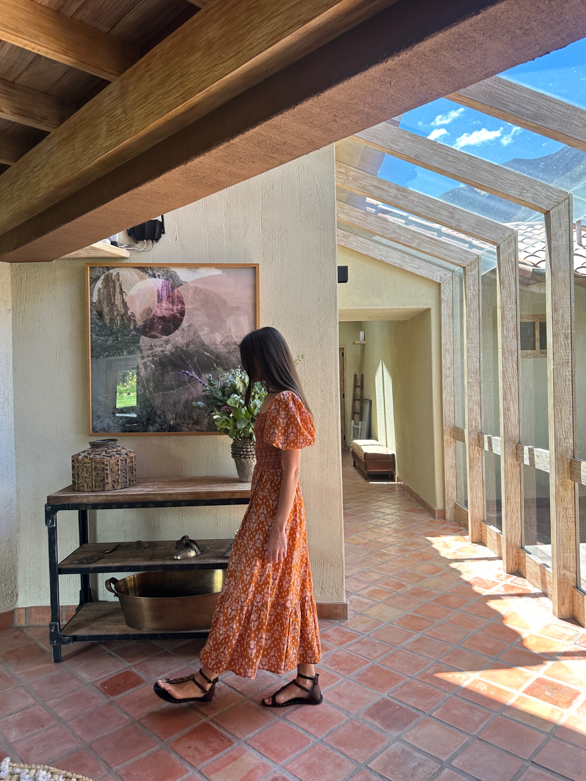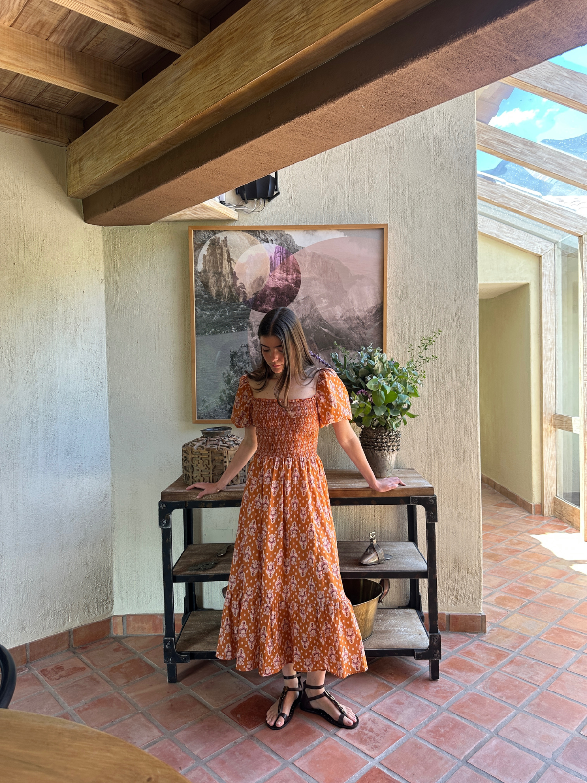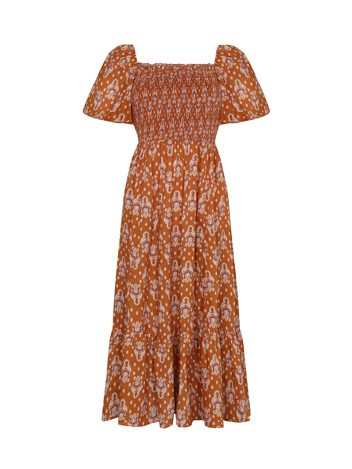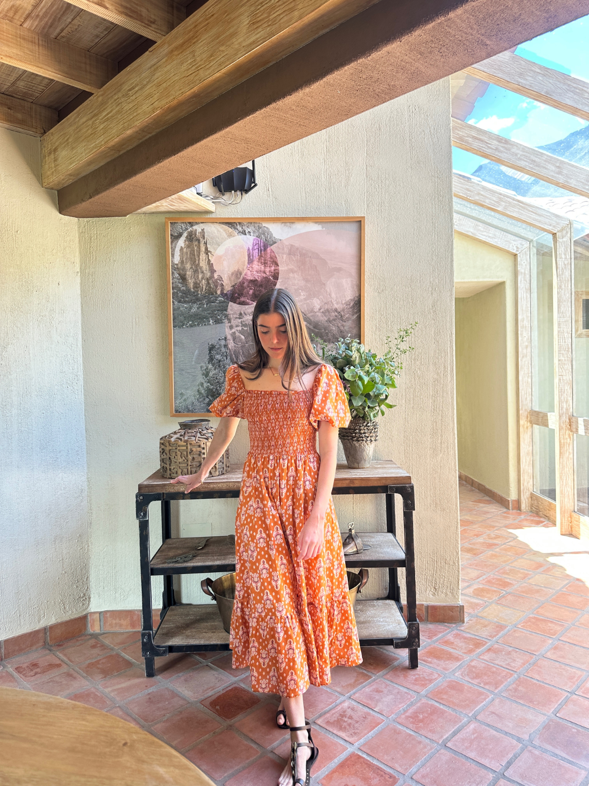 El vestido Camila tiene un cuerpo fruncido, una falda en corte A que llega aproximadamente hasta los tobillos y mangas abullonadas. Las mangas también se pueden llevar abajo para llevar los hombros descubiertos. 100% Algodón. Lavado delicado.