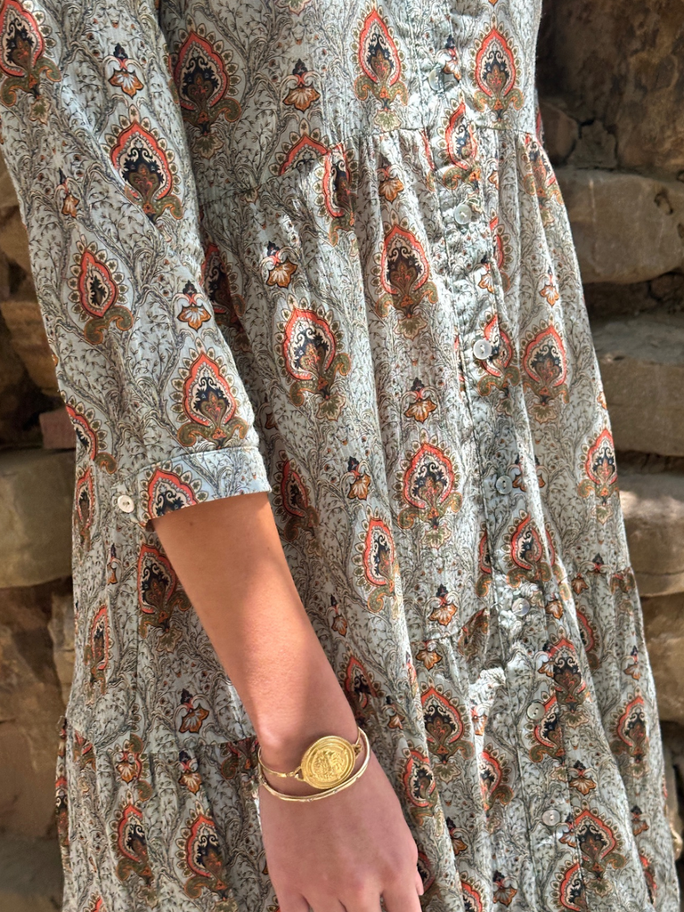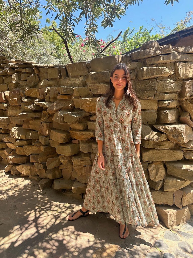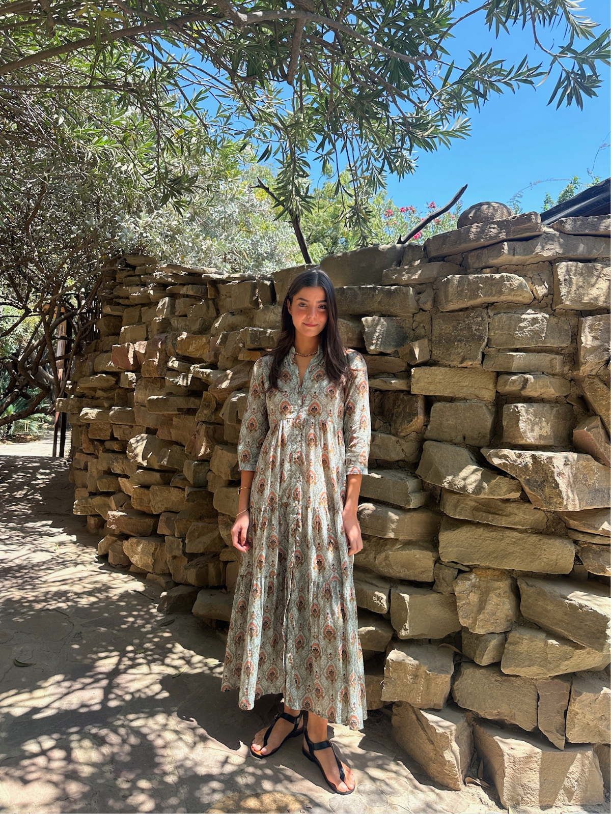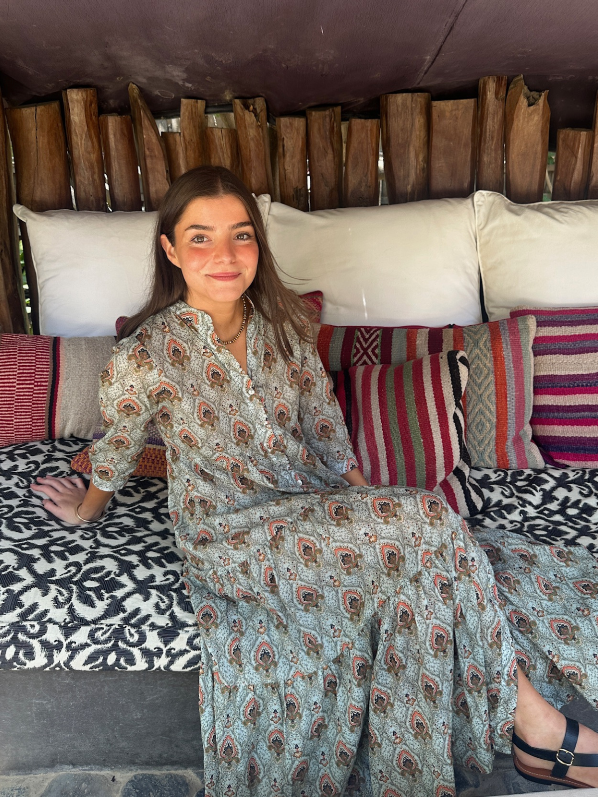 El Vestido Julieta está confeccionado en algodón 100%, con un tejido suave y ligeramente translúcido, ideal para climas cálidos. Tiene mangas largas 3/4 y cuenta con botones que van desde el escote en V hasta justo por encima de las rodillas, lo que lo hace adaptable a diferentes estilos. Úsalo completamente abierto como un cover-up fresco o abotonado para un look menos playero.